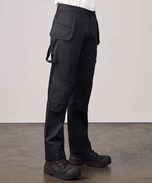 Zip fly front fastening. Part elasticated waist band with belt loops. Two side front tradesman pockets. Two upper leg utility pockets, right hand side ruler pocket, left hand side utility and phone pocket. External knee pad pockets with tear and release fastening. Two back patch pockets. Hammer loop. Twin-needle stitching on hem.