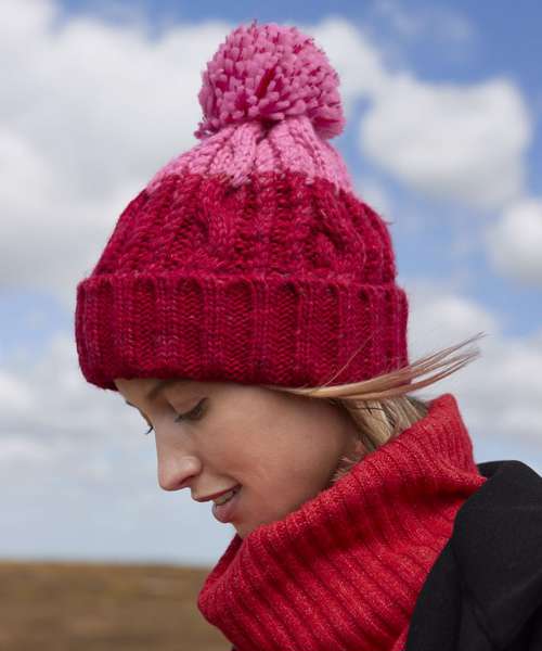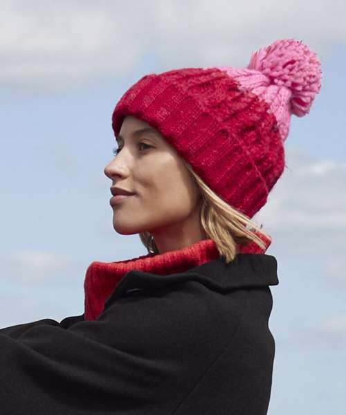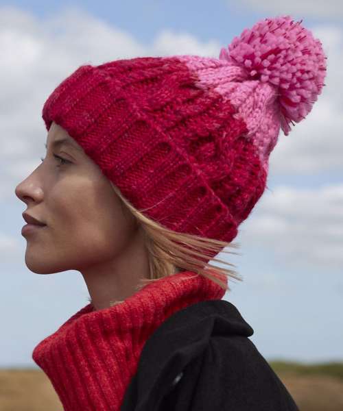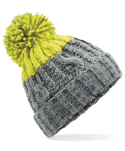 TearAway label for ease of rebranding. Heavyweight multi-yarn cable knit design. Bold two colour design. Luxury pom pom. Luxurious Shearling thermal band for extra warmth. Cuffed design for optimal decoration.