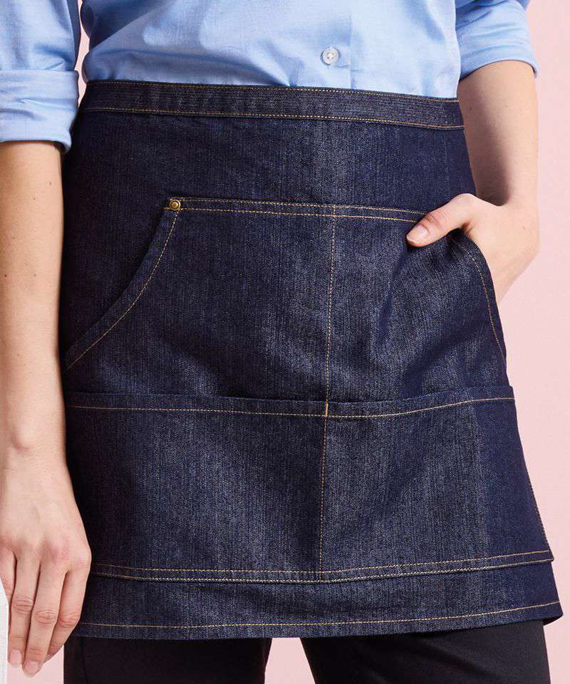 We have combined practicality with style and are proud to present this trendy denim waist apron that is a welcome addition to the hospitality wear collection. A popular cropped style featuring contrast stitch detail that forms four front pockets which are handy for carrying payment terminals and order pads. Self-fabric ties are long enough to be doubled and tied at the front completing a neat and professional uniform for service staff.